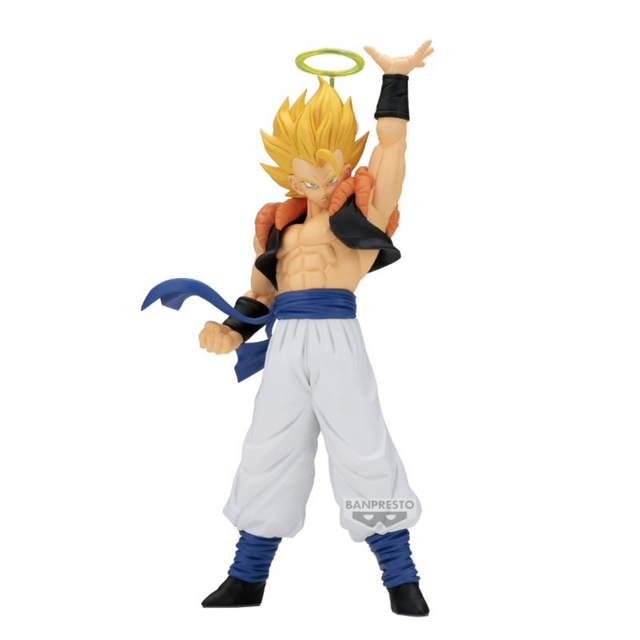 La fusion ultime entre Goku et Vegeta ! Cette Solid Edge Works représente Super Gogeta (version Fusion Reborn avec auréole) en train de charger sa Soul Punisher/Stardust Breaker : main droite levée, gilet orange, ceinture bleue et pantalon blanc typiques de la fusion. Sculpture anguleuse, volumes marqués et présence. Le modeling met en valeur la silhouette nerveuse de Gogeta : mèches dorées, gilet texturé et ceinture au mouvement naturel. La main levée et le regard perçant restituent l’instant précédant l’attaque Stardust Breaker — parfait en centre d’étagère, ou aux côtés d’un Janemba pour un duo “versus”.